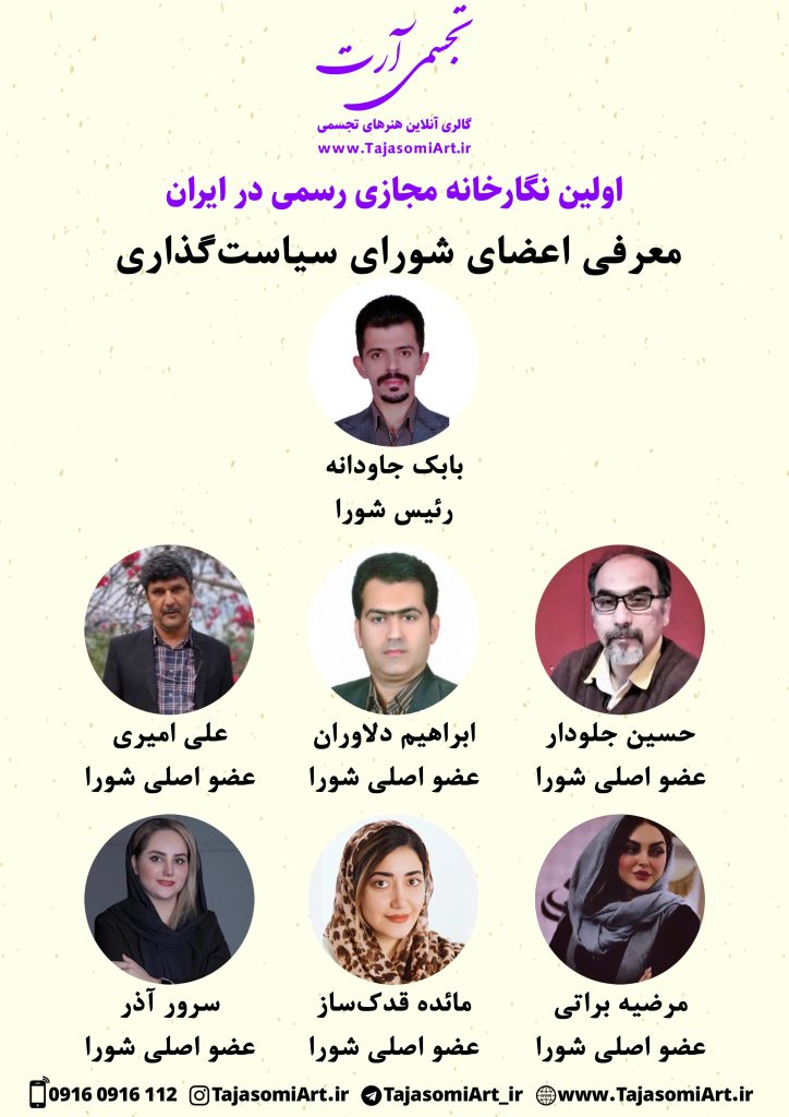 در راستای پیشبرد و پیشرفت نگارخانه مجازی تجسمی آرت و ارائه خدمات شایسته و ارزنده به هنرجویان، هنرمندان و متقاضیان گرامی؛ با تصمیم و پیشنهاد مدیرعامل موسسه هنرهای تجسمی سرای هنر تمدن جاودانه اقدام به تشکیل شورای سیاستگذاری برای این نگارخانه گردید؛ که در نهایت با تایید نهایی افراد زیر به عنوان اعضای اصلی شورا به مدت 3 سال معرفی میشوند: