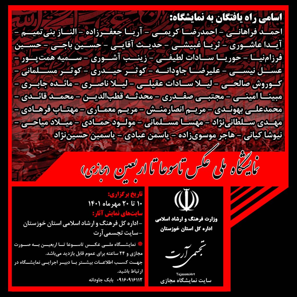 در فراخوان این نمایشگاه که به مدت ۴۱ روز زمان مهلت ارسال بود، تعداد ۱۷۴ اثر از ۶۷ عکاس از سراسر کشور به دست دبیرخانه این نمایشگاه رسید و در داوری که توسط اساتید محترم انجام شد، بین این آثار تعداد 40 اثر از ۳6 عکاس به انتخاب و تایید نهایی رسید که اسامی شرکت کنندگان برگزیده به شرح ذیل میباشند: