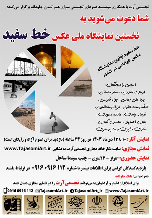 تجسمی آرت و موسسه هنرهای تجسمی سرای هنر تمدن جاودانه؛ با همکاری: اداره کل فرهنگ و ارشاد اسلامی خوزستان – حوزه هنری استان خوزستان – موسسه فرهنگی و تبلیغاتی بهمن سبز – سینما ساحل اهواز و چاپ چیستا برگزار میکند.