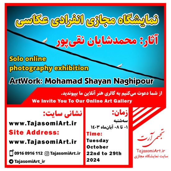 The exhibition of Mohamad Shayan Naghipour photographic works will be held from Tuesday, 22nd to 29th October, 2024 at the visual Art site. www.TajasomiArt.ir