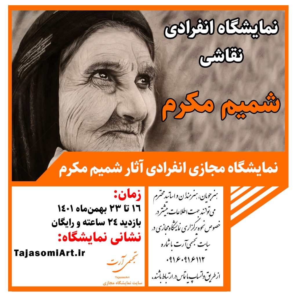 نمایشگاه مجازی انفرادی نقاشی آثار شمیم مکرم، از ۱۶ تا ۲۳ بهمن ماه ۱۴۰۱ در سایت تجسمی آرت برگزار خواهد شد.در این نمایشگاه مجازی تعداد ۱۵ اثر از شمیم مکرم به نمایش گذاشته خواهد شد. وی از دانشجویان کارشناسی نقاشی دانشگاه چمران اهواز – دانشکده هنر شوشتر می باشد.